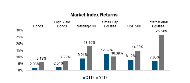 - Equity markets continued their resilience and run-up from the previous quarter, hitting fresh records along the way with the S&P 500 closing above 6,600 for the first time in September. Importantly, equities witnessed a broadening out, with small cap and international companies continuing to perform well with help from domestic interest rate cuts and more favorable valuations, respectively.