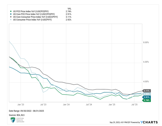 Inflation – Inflation increased marginally over the quarter and remains above the Fed’s 2% target as tariffs wreak havoc on supply chains and shelter inflation remains problematic. The latest data in August shows headline CPI and PCE inflation measures at 2.9% and 2.7%, respectively. Core CPI and PCE inflation is marginally higher at 3.1% and 2.9%, respectively. These increases have been in-line with expectations and have not prompted major market reactions; however, the full impact of tariffs has likely not been felt, meaning inflation could tick higher in the coming months as these tariff-induced price increases continue to trickle through the system.