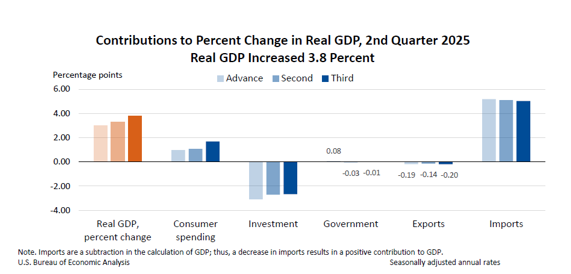 Economic Growth – GDP growth did a 180 in Q2, growing 3.8% after contracting 0.6% in Q1, but both quarters were muddled by tariffs. After seeing a surge in imports in the first quarter to get ahead of impending tariffs, the second quarter saw a major drop in imports, the largest contributor to the overall GDP figure in Q2. Consumer spending was relatively strong but was offset by a decline in investment in the second quarter print.