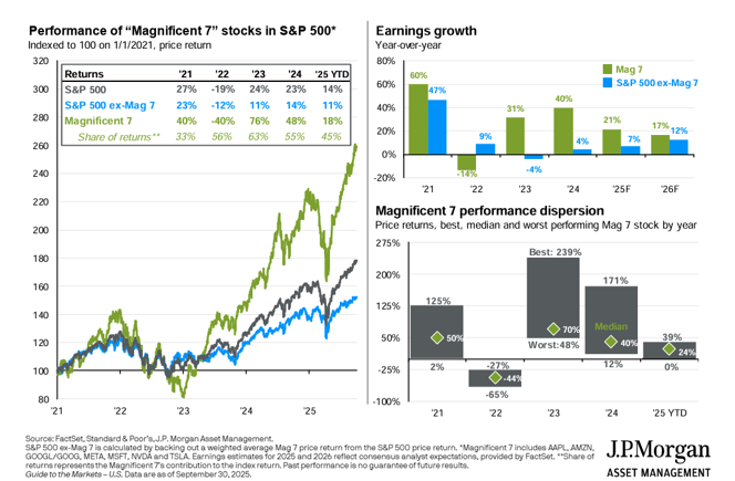 On the opportunities front, corporate earnings remain solid and market breadth is returning, with the Magnificent Seven stocks contributing to 45% of the overall returns in the S&P 500, compared to 55% and 63% in 2024 and 2023, respectively. This presents an opportunity for more unloved parts of the market to shine alongside tech names, like what was witnessed with small caps during the third quarter. And while the AI trade continues to prop equity markets up and is likely far from over, concentration risks remain prevalent, supporting the need for a more balanced allocation.