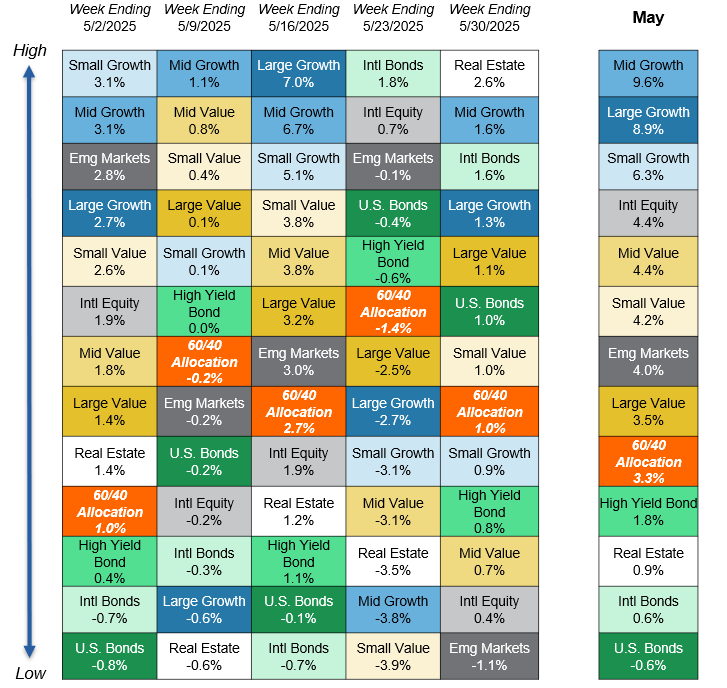 Source: YCharts. Asset class performance is presented using market returns from an exchange-traded fund (ETF) proxy that best represents its respective broad asset class. Returns shown are net of fund fees for and do not necessarily represent performance of specific mutual funds and/or exchange-traded funds recommended by Centura Wealth Advisory. The performance of those funds may be substantially different than the performance of broad asset classes and to proxy ETFs represented here. U.S. Bonds (iShares Core U.S. Aggregate Bond ETF); High Yield Bonds (iShares iBoxx $ High Yield Corp Bond ETF); Intl Bonds (Invesco International Corporate Bond ETF); Large Growth (iShares Russell 1000 Growth ETF); Large Value (iShares Russell 1000 Value ETF); Mid Growth (iShares Russell Mid-Cap Growth ETF); Mid Value (iShares Russell Mid-Cap Value ETF); Small Growth (iShares Russell 2000 Growth ETF); Small Value (iShares Russell 2000 Value ETF); Intl Equity (iShares MSCI ACWI ex US ETF); Emg Markets (iShares MSCI Emerging Markets ETF); and Real Estate (iShares US Real Estate ETF). The return displayed as “60/40 Allocation” is a weighted average of the ETF proxies shown as represented by: 40% U.S. Bonds, 12% International Stock, and 48% Large Blend.