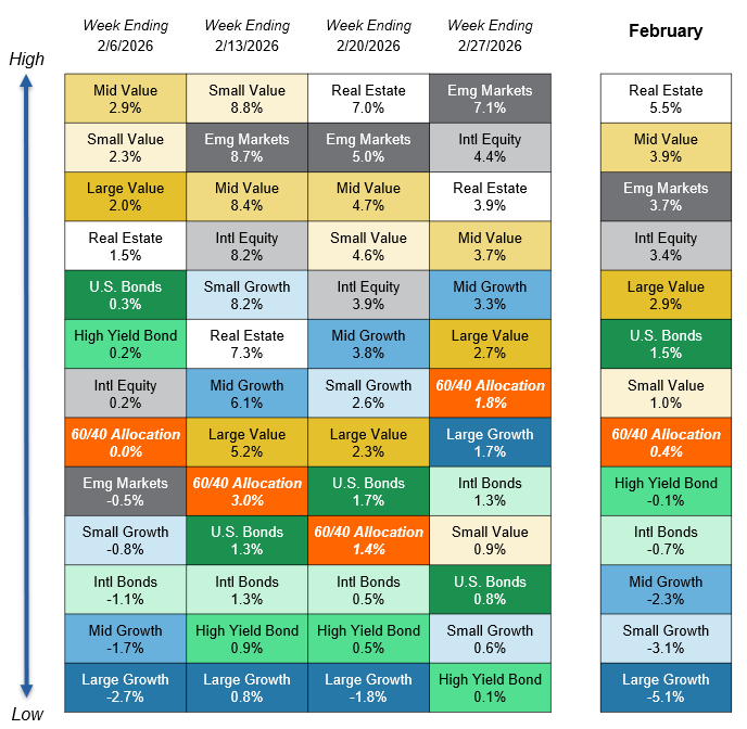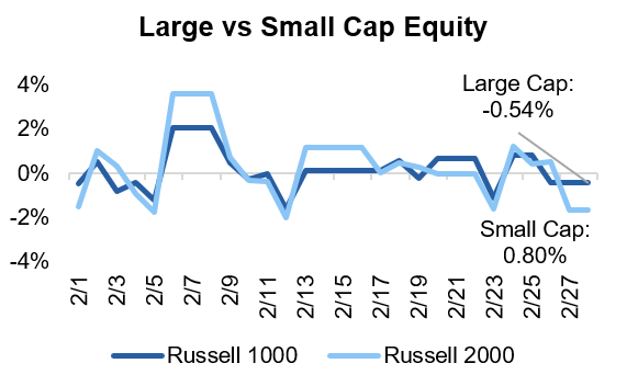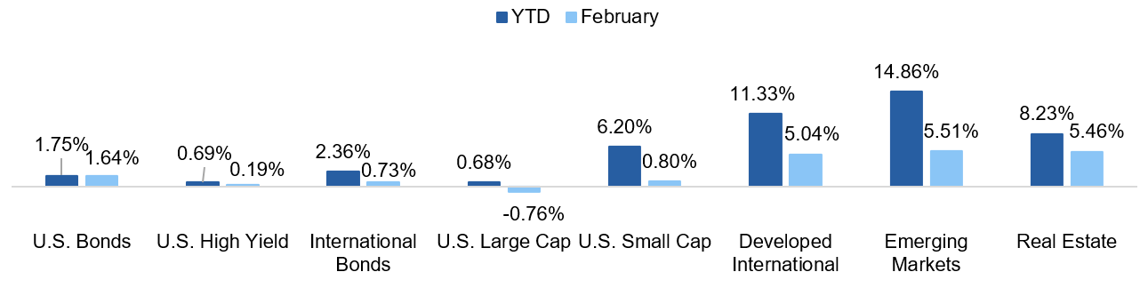 U.S. large cap equities posted negative returns in February as AI pressures prompted sell-offs in the technology and financials sectors. Longer-term Treasury yields declined over the month, contributing to positive total returns. International equities continued their run-up, driven by Asian markets.