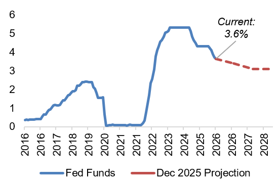 Fed & Monetary Policy: Rates are expected to stay on hold through the end of Chair Powell’s tenure. His likely successor, Kevin Warsh, is expected to come in with a rate-cutting bias and a desire to slim down the Fed’s balance sheet, but the macro data may threaten these plans.