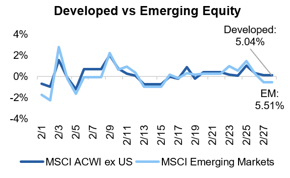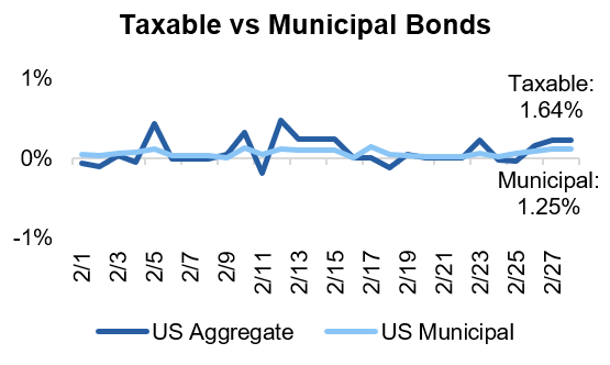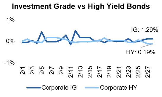 •Long Duration Looks Attractive: With uncertainty running high, investors fled to safety and pushed further out on the yield curve, rewarding long duration bonds with a 1.82% return in February.