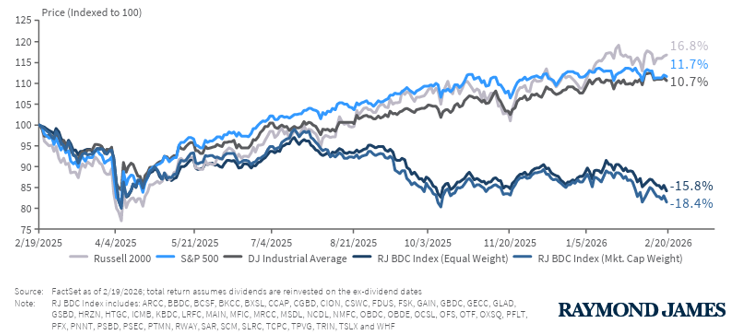 So why are BDCs in the news today? Over the past decade, they have steadily loaded up on software companies – and for good reason. Enterprise software historically has had low default rates thanks to sticky customers and a predictable, recurring revenue stream, prompting BDCs to increase their exposure, illustrated in Exhibit 5. With rapid advancements in AI in recent months, this thesis is starting to crack open, threatening not just the revenues of these software companies, but their existence as a whole. While the AI-driven sell-off in BDCs began in earnest in mid-2025, illustrated in Exhibit 6, it has accelerated in recent weeks, fueling headlines. Importantly, the structure of BDCs has played a role in this sell-off – the combination of daily pricing, a concentration in illiquid underlying holdings, and a roughly 20% exposure to software created the perfect storm. The lesson here is not that BDCs are bad investments, but that an investment’s vehicle is an important consideration. Put another way, investors should be reminded that it is not simply what you own that matters, but how you own it. When markets get jittery and everyone rushes for the door at once, structure matters just as much as substance.